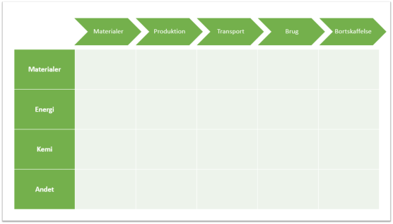 - Materialer – Fx forbrug af knappe ressourcer, affald og genanvendelse